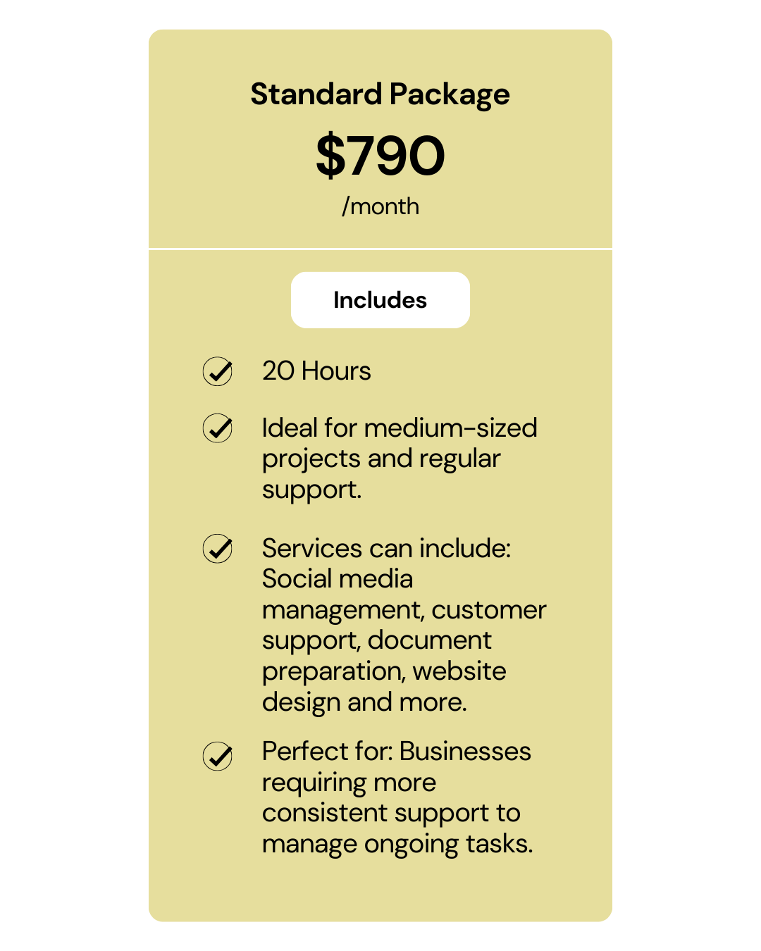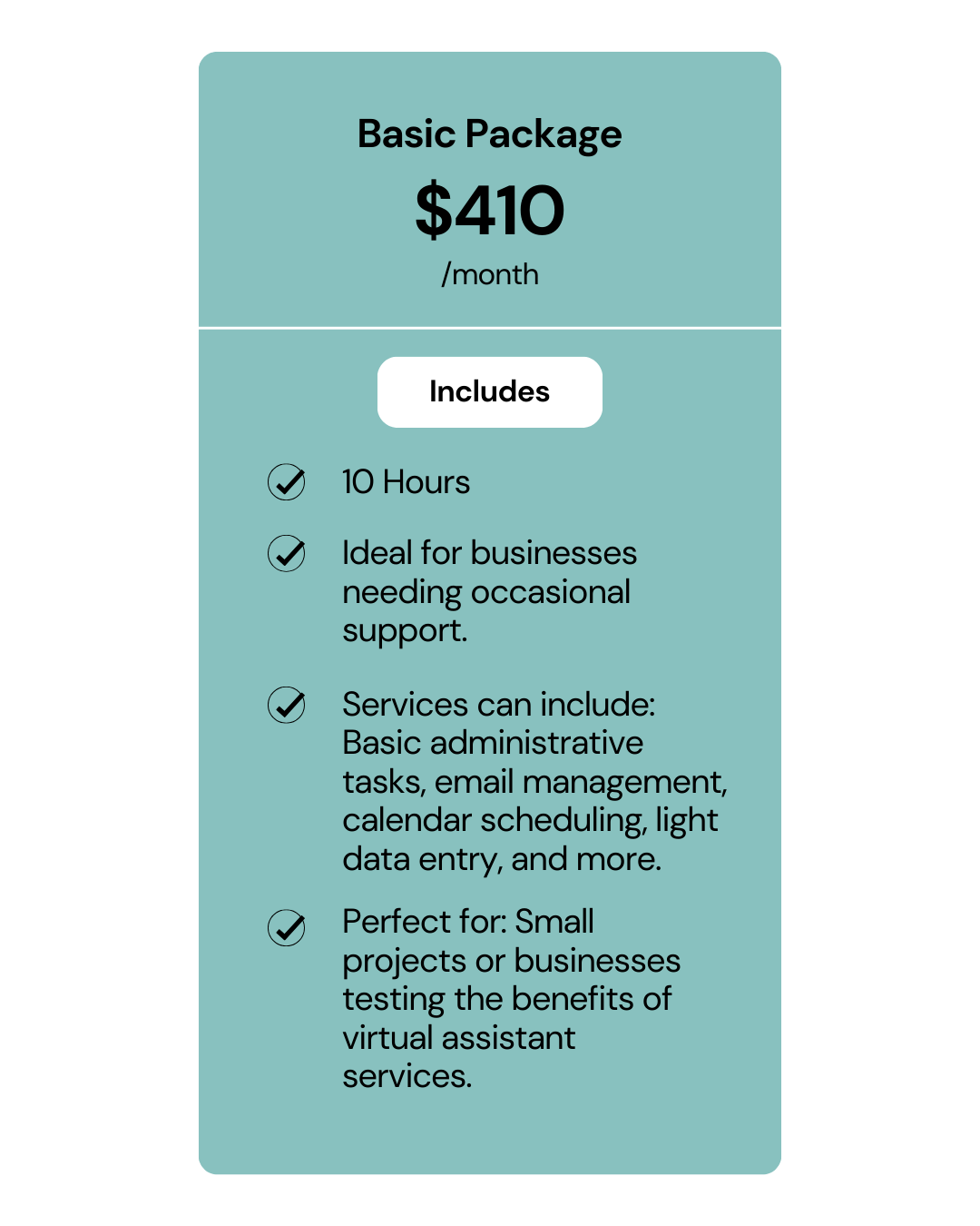The services below are simple examples of what an assistant can handle during the allocated hours. If you require one service; website creation etc, for (ex. 30 hours) this can be discussed during the FREE initial call.